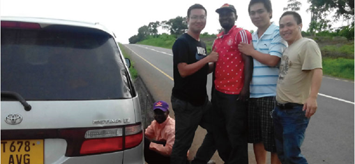 借來的子彈頭,超載拉著我們九員大將回達(dá)市途中,爆胎兩次還沒找到千斤頂,幸好都有好心黑人幫忙.車再次交到我的手上,輪胎就成了這個(gè)樣子,輪胎媽媽都不認(rèn)識(shí)他了。苦中作樂,我們跟好心的黑人合個(gè)影吧!各種困難,我們還是微笑面對(duì),這就是馭邦!